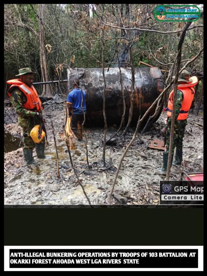 In a related development, following a tip-off on illegal oil bunkering activities around a pipeline after Sterling Global Company Road, Akpabo, at Elele Alimini in Emohua LGA, troops swung into action and impounded a tanker with registration number Rivers JJN 287 ZU coming out of the pipeline right of way. The vehicle was suspected to have loaded about 90,000 litres of stolen products from the site. Two suspects, the driver and his motor boy, were taken into custody. Also, at Okolomade in Abua/Odual LGA, over 2,600 litres of illegally refined Automotive Gas Oil were recovered.