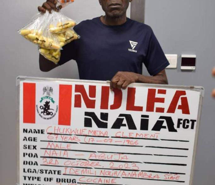 Operatives of the National Drug Law Enforcement Agency, NDLEA, have arrested a 67-year-old trafficker, Chukwuemeka Clement, at the Nnamdi Azikiwe International Airport, NAIA, Abuja for ingesting 100 wraps of cocaine, a criminal enterprise he claimed he ventured into to raise enough money to marry a new wife and start life afresh after wasting 30 years of his life in Brazil, Ethiopia and Thailand.