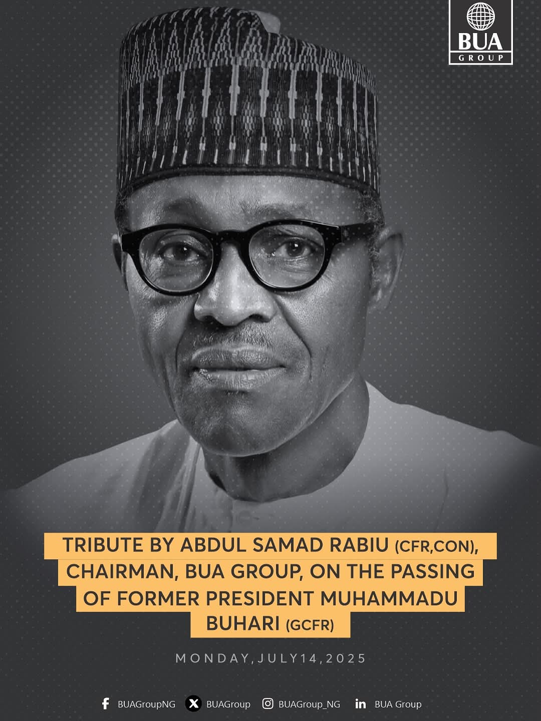 “TRIBUTE BY ABDUL SAMAD RABIU (CFR, CON), CHAIRMAN, BUA GROUP, ON THE PASSING OF FORMER PRESIDENT MUHAMMADU BUHARI (GCFR)” reads…