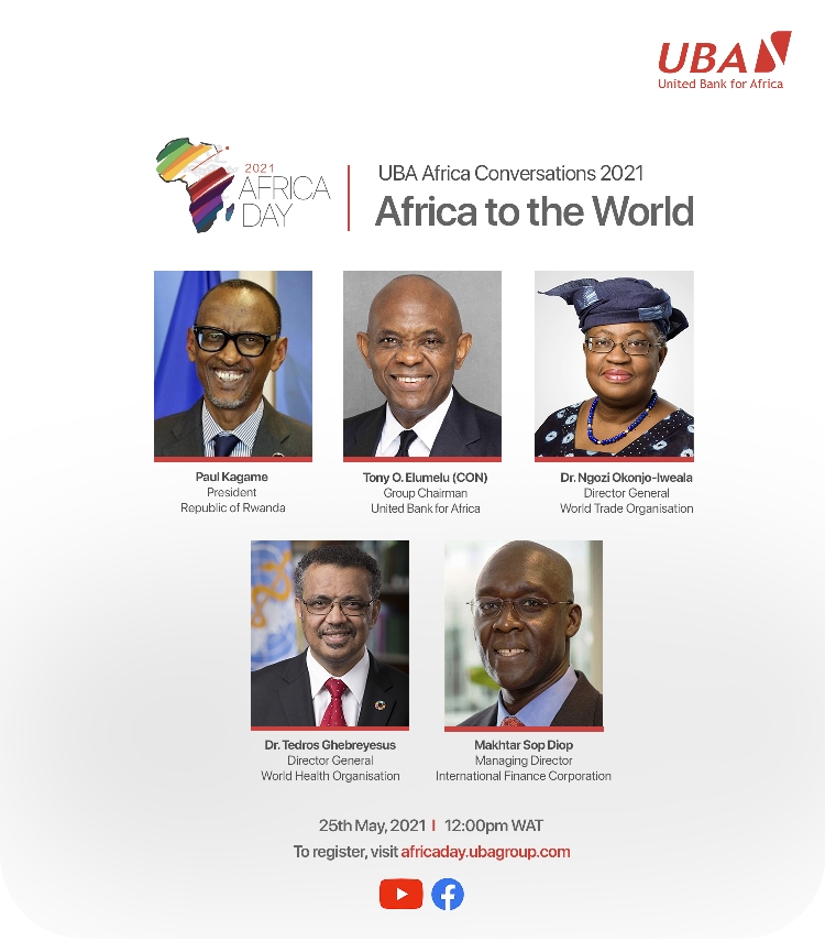 The United Bank for Africa (UBA) Plc, is set to celebrate this year’s Africa Day in commemoration of African unity with the third edition of its annual UBA Africa Conversations, headlined by Africa’s international leaders that include the President of Rwanda, H.E Mr Paul Kagame; Mrs Ngozi Okonjo-Iweala, Director-General of the World Trade Organisation(WTO); Dr Tedros Adhanom Ghebreyesus, Director-General of the World Health Organisation(WHO) and Mr. Makhtar Sop Diop, Managing Director, International Finance Corporation(IFC). The conversations will be held online on africaday.ubagroup.com