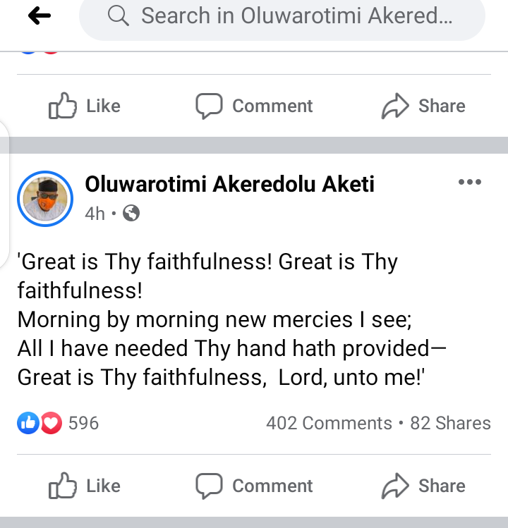 ‘Great is Thy faithfulness! Great is Thy faithfulness!Morning by morning new mercies I see;All I have needed Thy hand hath provided—Great is Thy faithfulness, Lord, unto me!’, joyous Akeredolu posted on his Facebook page.