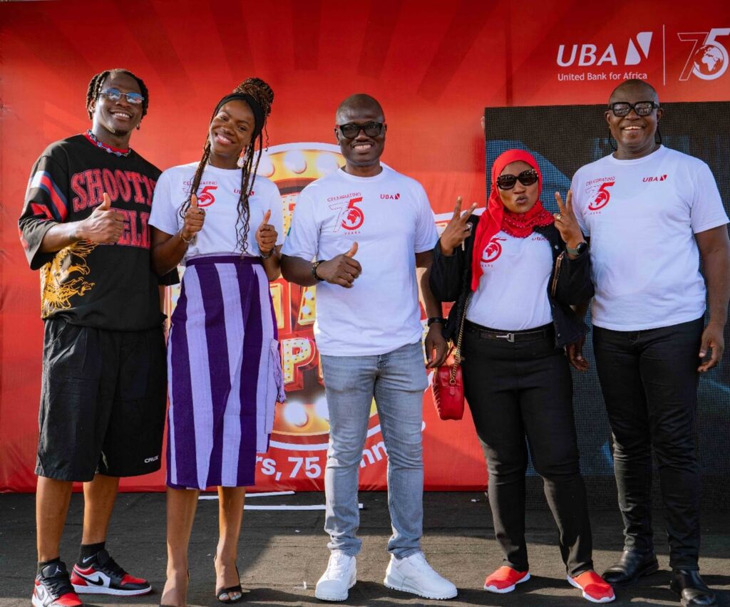 YouTuber, content creator and social media influencer,Akinyemi Omotayo (Asherkine); Content Developer, UBA, Nnenna Ukpabi; Group Head, Retail and Digital Banking, United Bank for Africa, Shamsideen Fashola; One of the winners, in the ongoing UBA@75 Legacy Promo; Regional Head, Lagos, UBA, (Plc) Aminat Tunji Akinwande and Head, Retail Products and Sales, UBA, Prince Ayewoh during the promo raffle draw, dedicated to reward customers in commemoration of the banks 75th anniversary, held in Lagos on Saturday, October 26, at Ikeja City Mall, Lagos