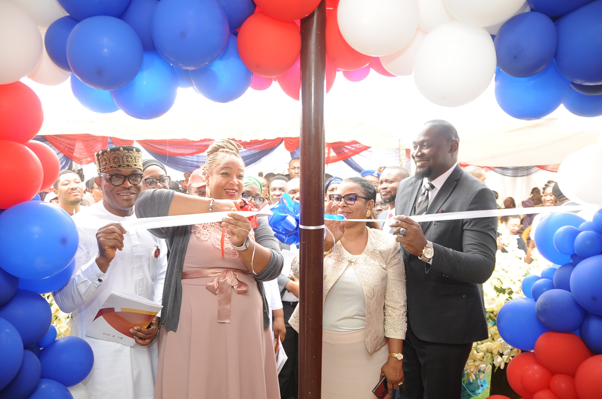 Dr. T. Balogun (Director, Planning, Research and Statistics, PHC Board, Lagos State); Hon. (Princess) Olabisi Adebayo (Chairperson, Mosan LCDA, Alimosho); Dr. Ubon Udoh, MD/CEO, ASR Africa, Omosalewa Oyelaran, Deputy Director, HIV&TB Office, USAID Nigeria, and Dr. Anyike Chukwuma (Director, Public Health, Federal Ministry of Health) during the official handover of the Directly-Observed Treatment Short-course (DOTS) Centre at Akinyele PHC, Mosan LCDA, Alimosho, Lagos State.