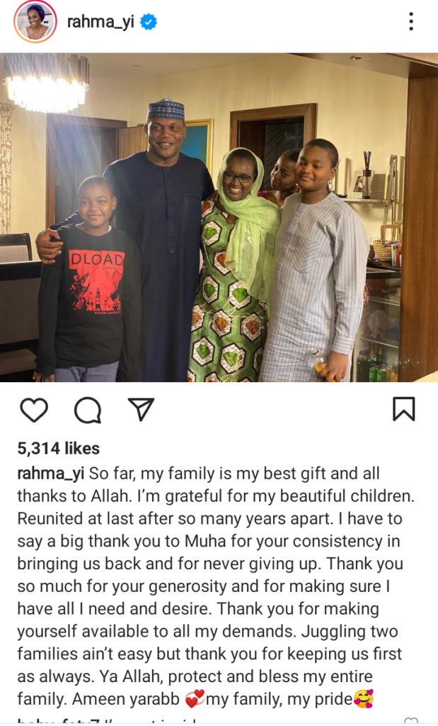 “So far, my family is my best gift and all thanks to Allah. I’m grateful for my beautiful children. Reunited at last after so many years apart. I have to say a big thank you to Muha for your consistency in bringing us back and for never giving up. Thank you so much for your generosity and for making sure ! have all I need and desire. Thank you for making yourself available to all my demands. Juggling two families ain’t easy but thank you for keeping us first as always. Ya Allah, protect and bless my entire family. Ameen yarabb my family, my pride”,.