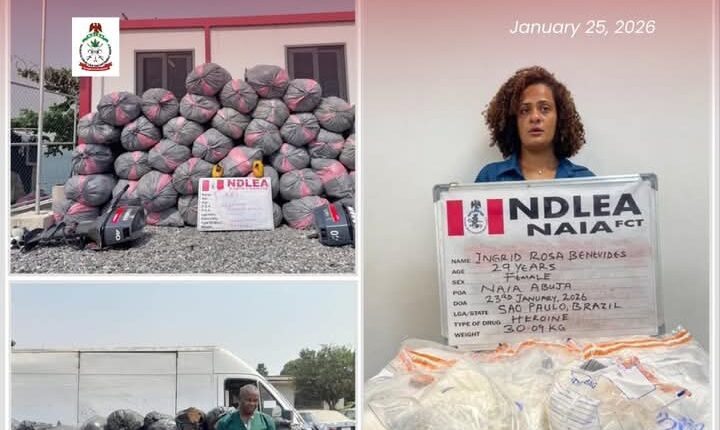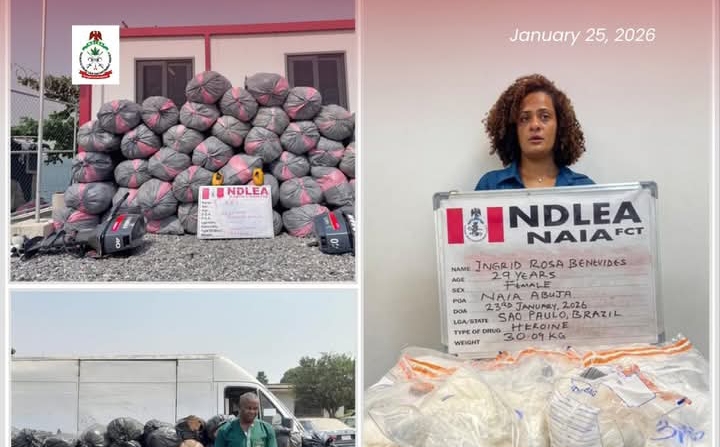 A 30-year-old Brazilian lady, Ms. Ingrid Rosa Benevides has been arrested by operatives of the National Drug Law Enforcement Agency (NDLEA) at the Nnamdi Azikiwe International Airport Abuja for bringing into Nigeria a total of 30.09 kilograms of white heroin concealed in factory sealed coffee packs worth over N3 billion in street value.