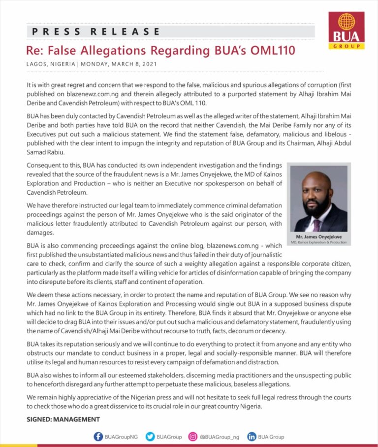 Therefore, BUA finds it absurd that Mr. Onyejekwe or anyone else will decide to drag BUA into their issues and/or put out such a malicious and defamatory statement, fraudulently using the name of Cavendish/Alhaji Mai Deribe without recourse to truth, facts, decorum or decency.BUA takes its reputation seriously and we will continue to do everything to protect it from anyone and any entity who obstructs our mandate to conduct business in a proper, legal and socially-responsible manner.