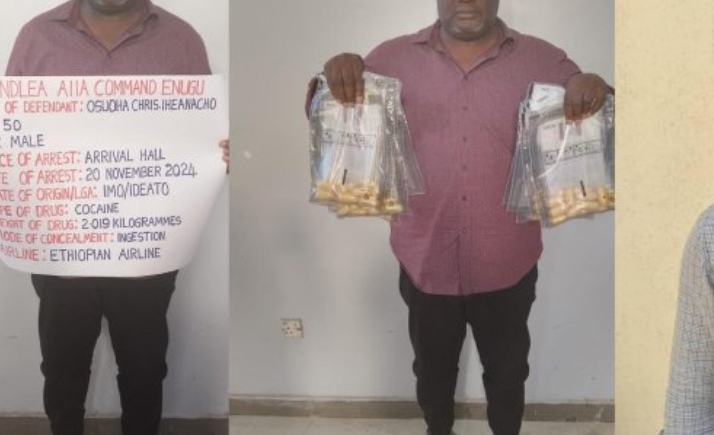 Operatives of the National Drug Law Enforcement Agency, NDLEA, have arrested a 50-year-old businessman, Osuoha Christian Iheanacho, at the Akanu Ibiam International Airport, AIIA, Enugu, for ingesting 90 wraps of cocaine.