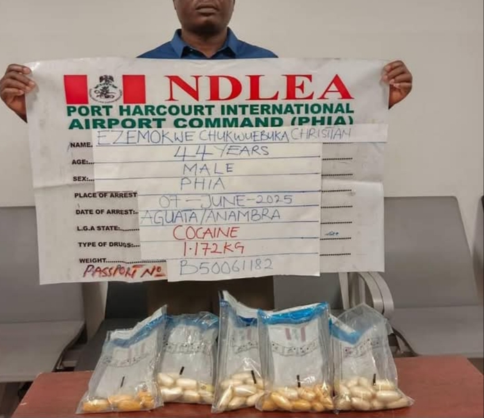 Barely two weeks after operatives of the National Drug Enforcement Agency (NDLEA) at the Mallam Aminu Kano International Airport (MAKIA) Kano, intercepted a 60-year-old businessman Chinedu Leonard Okigbo heading to Iran with 65 pellets of cocaine in his stomach, their counterparts at the Port Harcourt International Airport (PHIA) have arrested another businessman, 44-year-old Ezemokwe Chukwuebuka Christian for ingesting 53 wraps of the same class A drug while on his way to Tehran Khomeini, Islamic Republic of Iran.
