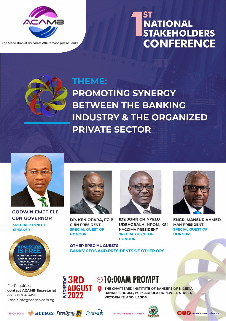 The Association of Corporate Affairs Managers of Banks (ACAMB) has concluded arrangement to hold its first National Conference on Synergy between the Nigerian Banking Industry and the Organised Private Sector (OPS).