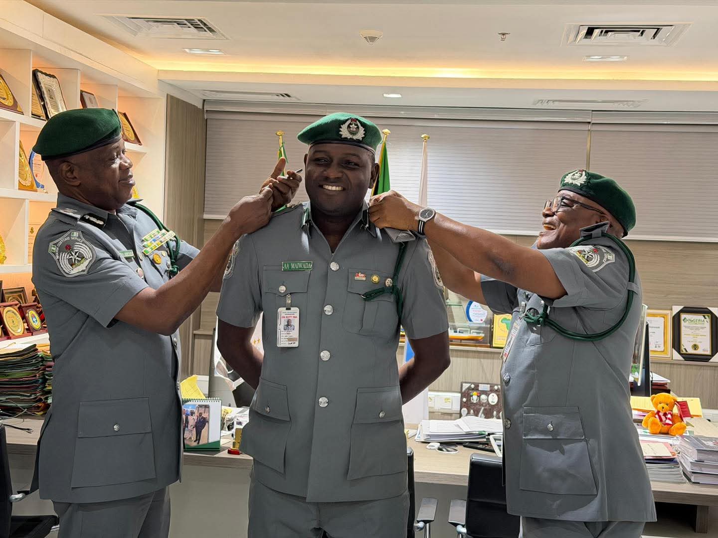 The Comptroller-General of the Nigeria Customs Service (NCS), Adewale Adeniyi, on Tuesday, 9 December 2025, at the Customs House, Maitama, Abuja, made another historic mark as he decorated the immediate past Spokesperson of the Agency, Timi Bomodi, to the rank of Deputy Comptroller General of Customs and the current National Public Relations Officer, Abdullahi Maiwada, who has now attained the rank of Deputy Comptroller of Customs (DC).