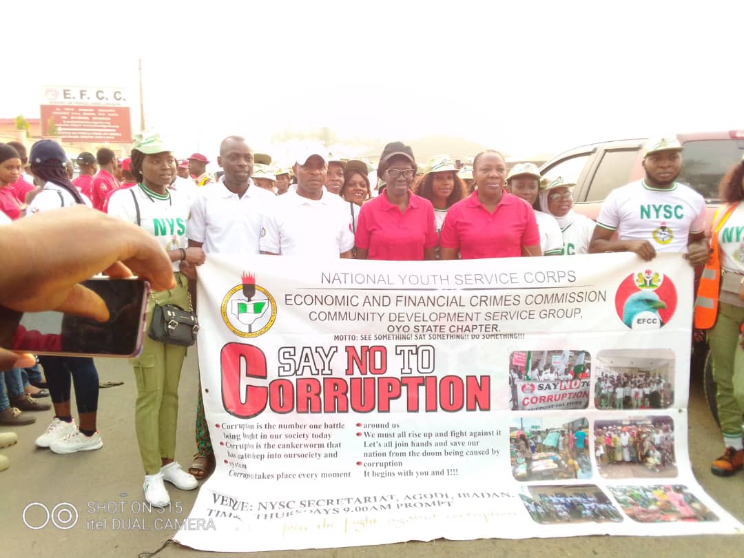 Ambekemo made the assertion during the anti-corruption Walk in collaboration with the Economic and Financial Crime Commission. The one kilometer Walk tagged, ” Nigerian Youth Walk Against Corruption” which commenced from the EFCC Zonal Office Ibadan with over 500 Corps members raising their voices against corruption.