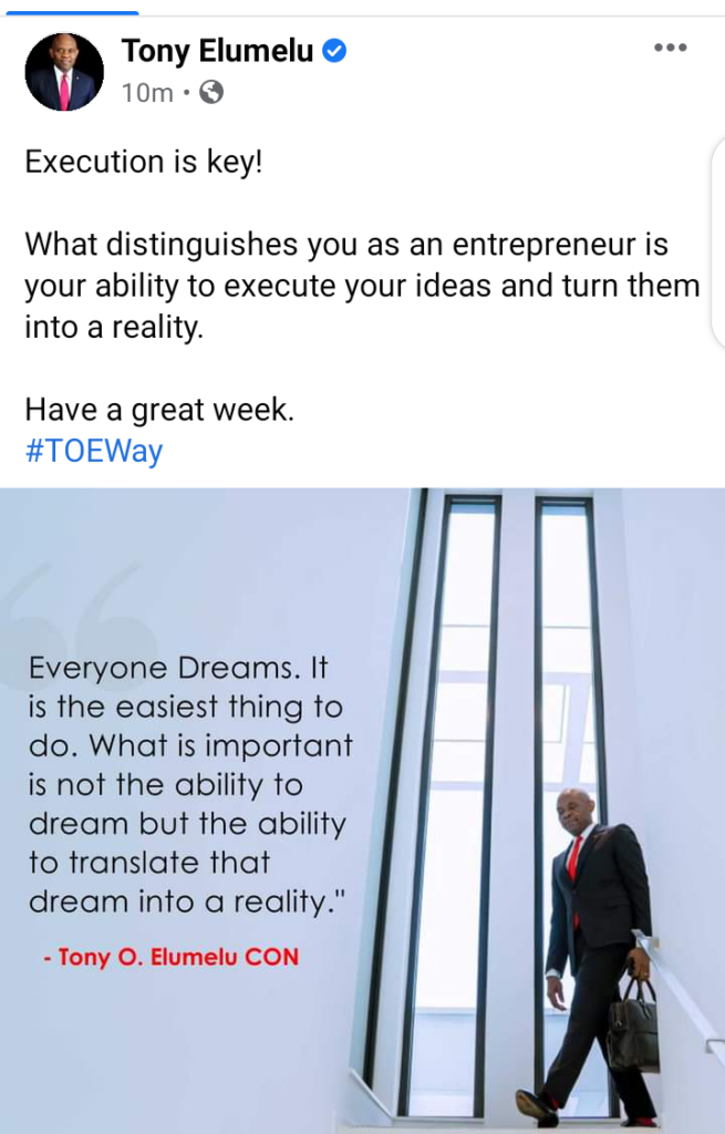 In a post via his Facebook page on Monday, May 31, Elumelu, who is also the chairman of Heir Holdings, maintained “Execution is key!” to entrepreneurship.