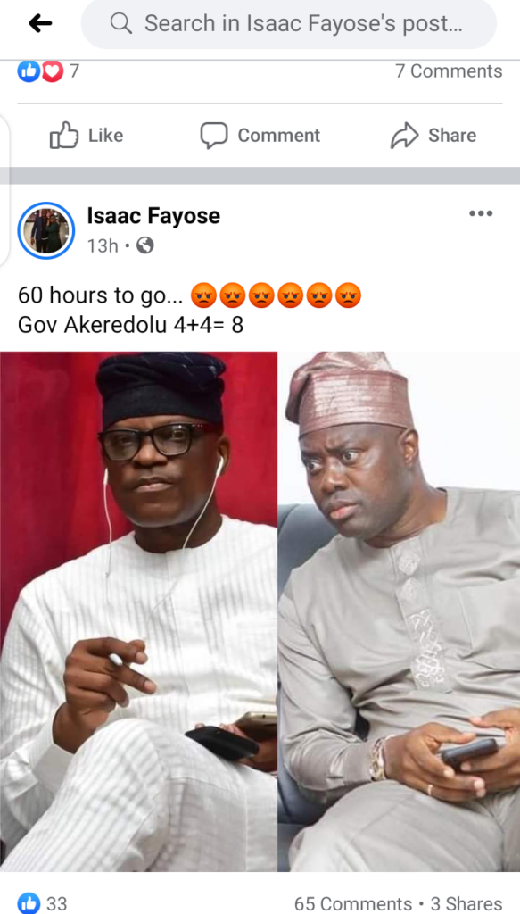 “60 hours to go… 😡😡😡😡😡😡 Gov Akeredolu 4+4= 8”, the younger Fayose had posted with pictures of the three major candidates – Rotimi Akeredolu, Eyitayo Jegede and Agboola Ajayi of Zenith Labour Party ZLP.