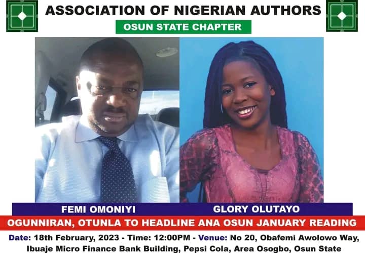 The Association of Nigerian Authors (ANA) Osun Chapter is pleased to announce its February Reading, featuring two talented writers, Femi Omoniyi and Glory Olutayo.