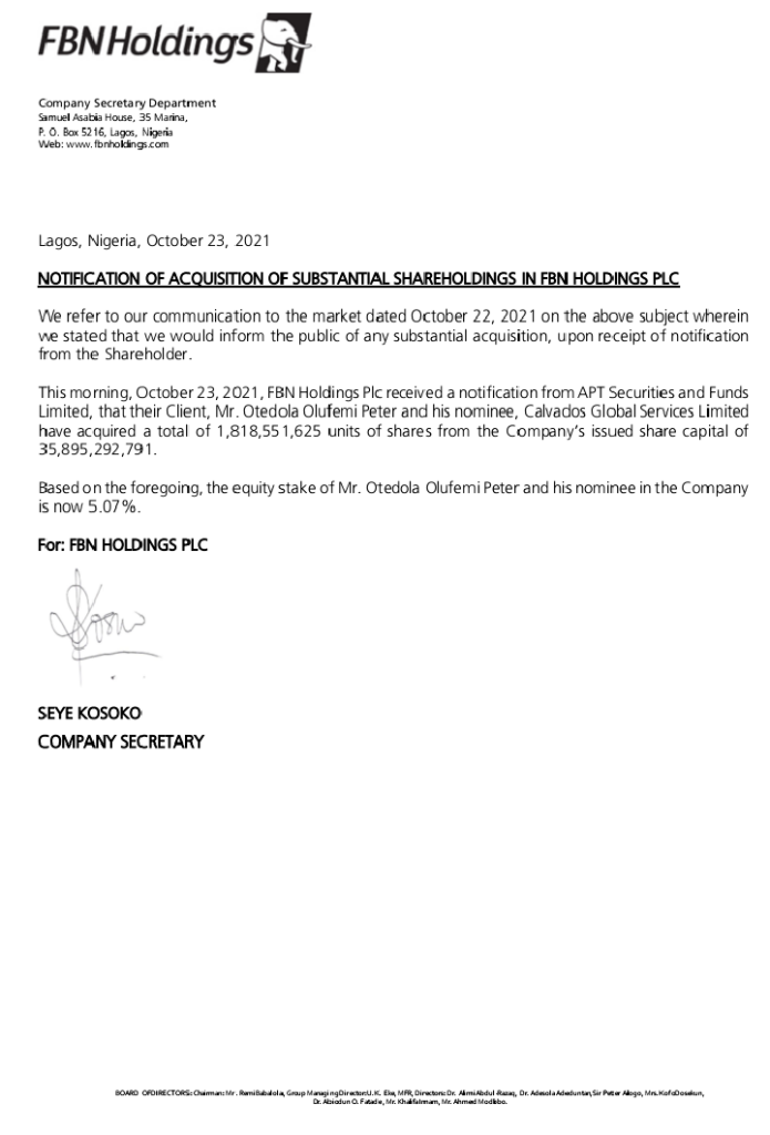 This morning, October 23, 2021, FBN Holdings Plc received a notification from APT Securities and Funds Limited, that their Client, Mr. Otedola Olufemi Peter and his nominee, Calvados Global Services Limited have acquired a total of 1,818,551,625 units of shares from the Company’s issued share capital of 35,895,292,791.