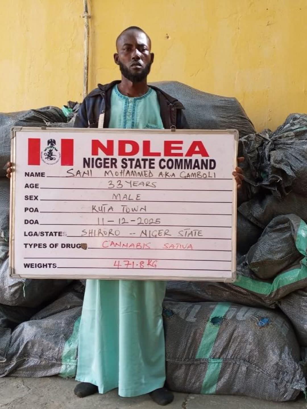 Following credible intelligence about the illicit drug activities of Gamboli, NDLEA operatives had on 20th November 2025 raided his house at Anguwan Makera, Kuta, where they recovered 471.8 kilograms of skunk, a strain of cannabis. Though he escaped arrest during the raid and has since been in hiding, the manhunt for him eventually paid off on Thursday 11th December when NDLEA officers acting on processed intelligence traced and arrested him at one of his drug joints in Anguwan Fadama, Kuta. Intelligence reports had indicated that Gamboli is a major supplier of illicit drugs to bandits operating in Shiroro local government area.