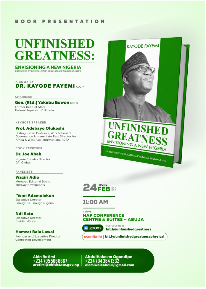The foreward was written by H.E. General (Rtd.) Abdulsalami Abubakar, GCFR, Former Head of State, and in it he said “The title Unfinished Greatness inspires hope in us that our march into the future is a purposeful journey of destiny.” In the words of H.E. Dr. John Dramani Mahama, Former President of Ghana: “Nigeria remains central to the vision of an African renaissance. In Unfinished Greatness, Fayemi reminds us of the power of unity in nation building. The ideas in this book encapsulate the roadmap for peace and sustainable development in Nigeria, and indeed the rest of Africa”, while Professor Tunde Adeniran, Former Minister of Education states that “Unfinished Greatness convincingly challenges false narratives about our trajectory as a country and offers profound historical insights to prove that there is more that unites us than our differences.”