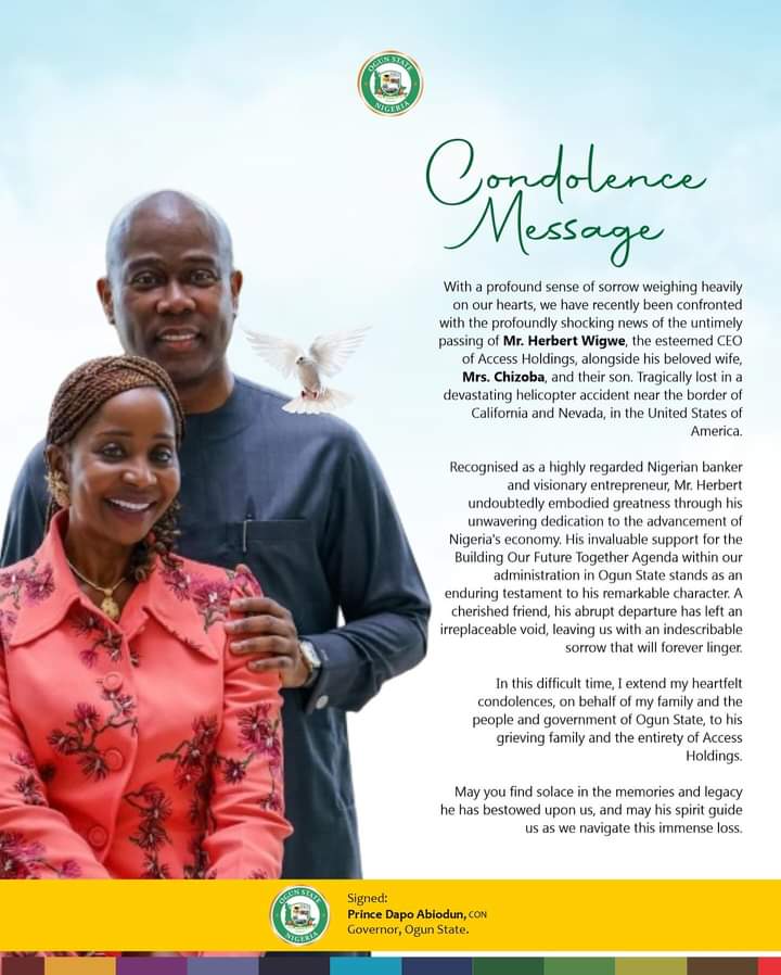 The Governor of Ogun State, Prince Dapo Abiodun has reacted to the sad demise of top banker and the Chief Executive Officer of Access Holdings, Herbert Wigwe alongside his wife, Chizoba and son in a helicopter crash in the United State of America.