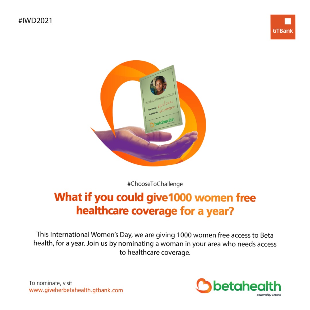 With the #GiveHerBetaHealth campaign, the Bank is calling on the general public to nominate 1000 women who will be given free BetaHealth coverage for a year. To nominate a woman, visit giveherbetahealth.gtbank.com.
