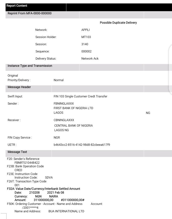 This payment was made immediately after the meeting and BUA transferred the money to the CBN (see payment confirmation attached) in order to meet the deadline.