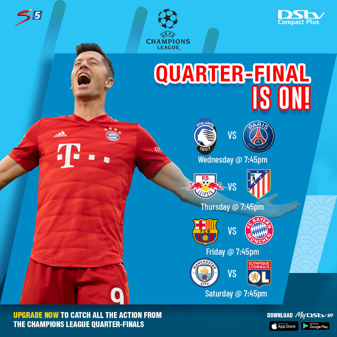 SuperSport viewers on DStv can enjoy the continued return of the UEFA Champions League, as the quarterfinal ties will be played this week, starting Wednesday 12 – Saturday 15 August 2020.