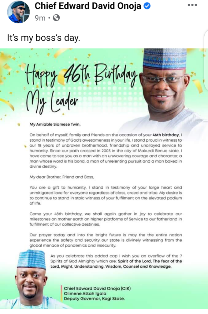 The Deputy Governor of Kogi State, Edward Onoja has specially reached out to his boss and governor, Yahaya Bello on his birthday.