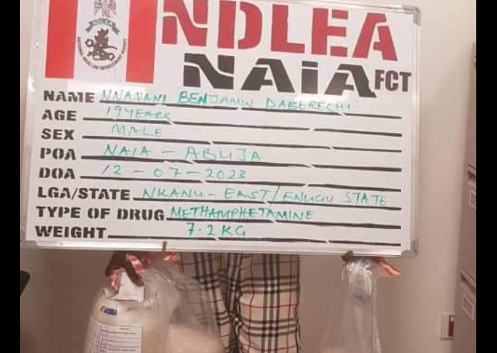 Operatives of the National Drug Law Enforcement Agency, NDLEA, at the Nnamdi Azikiwe International Airport, NAIA Abuja have arrested a 19-year-old student, Benjamin Nnamani Daberechi for attempting to export 7.2 kilograms of methamphetamine concealed in crayfish to Europe where he was going for undergraduate studies.