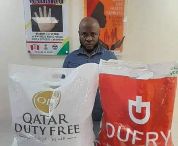 An initial search of the suspects two checked in bags almost made him a free man as there was nothing incriminating found there until the NDLEA officers took a second look at the duty-free shopping nylon bags containing packs of candies he was holding in his hands.