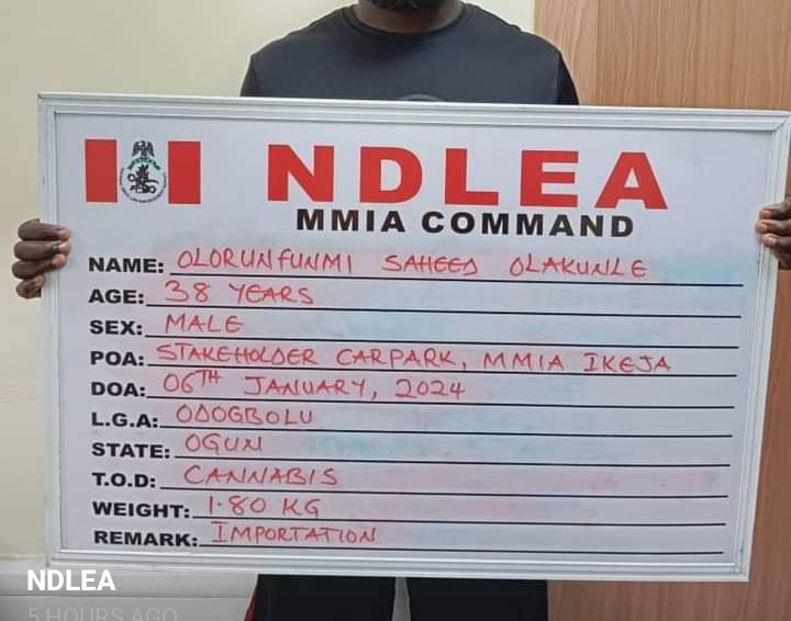 A weeklong intelligence-led operation to get the receiver arrested was consummated on Saturday 6th January following the successful tracking and arrest of 38-year-old Olorunfunmi Saheed Olakunle who distributes the dangerous psychoactive substance to dealers across Lagos state. The consignment had arrived the country on Monday 1st January via Cairo on Egypt Airlines flight marked as boxing kits.