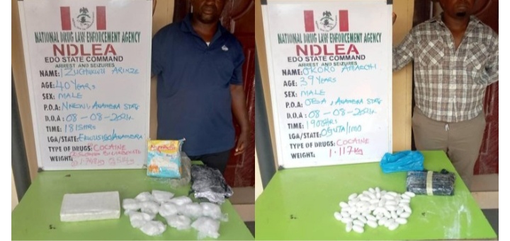While the bus driver, Harrison Mbachu, 44, was arrested at Benin tollgate with a total of 2.865kg cocaine, Izuchkwu Arinze, 40, was picked at Nnewi town while attempting to collect his own consignment of 1.748kg cocaine and 514 grams sodium bicarbonate, with Ameachi Okoro, 39, arrested while trying to pick his own 1.117kg cocaine at Oba town.