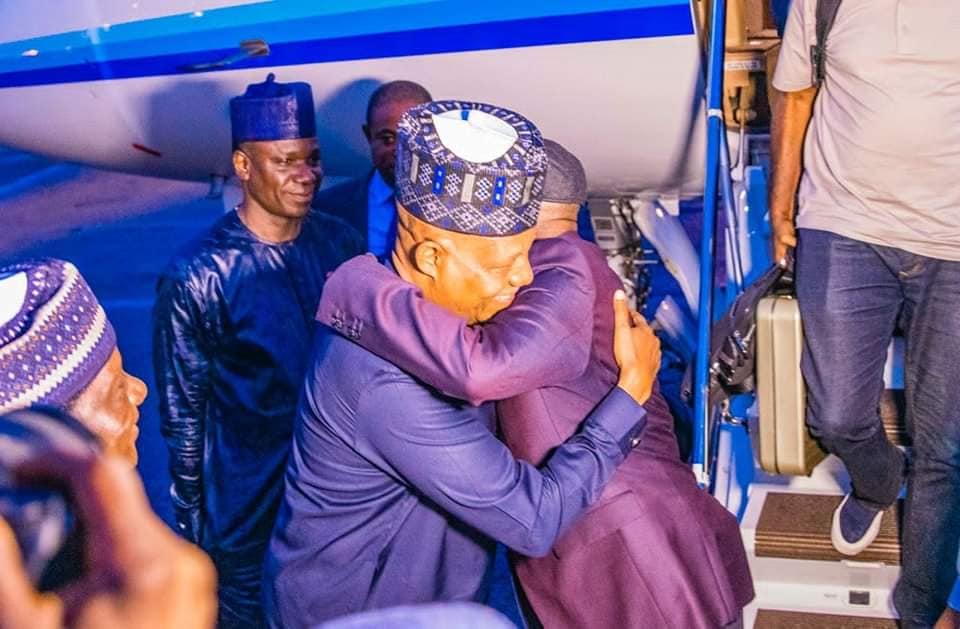 Kashim Shettima, his running mate, led the team that received him at the airport.