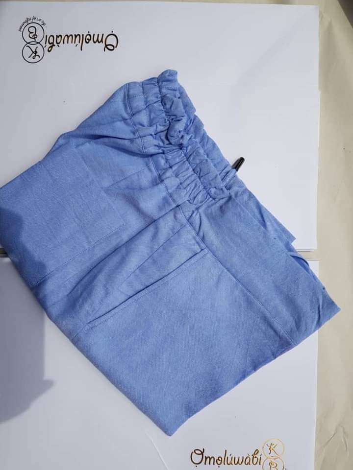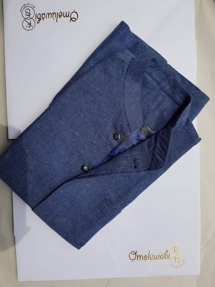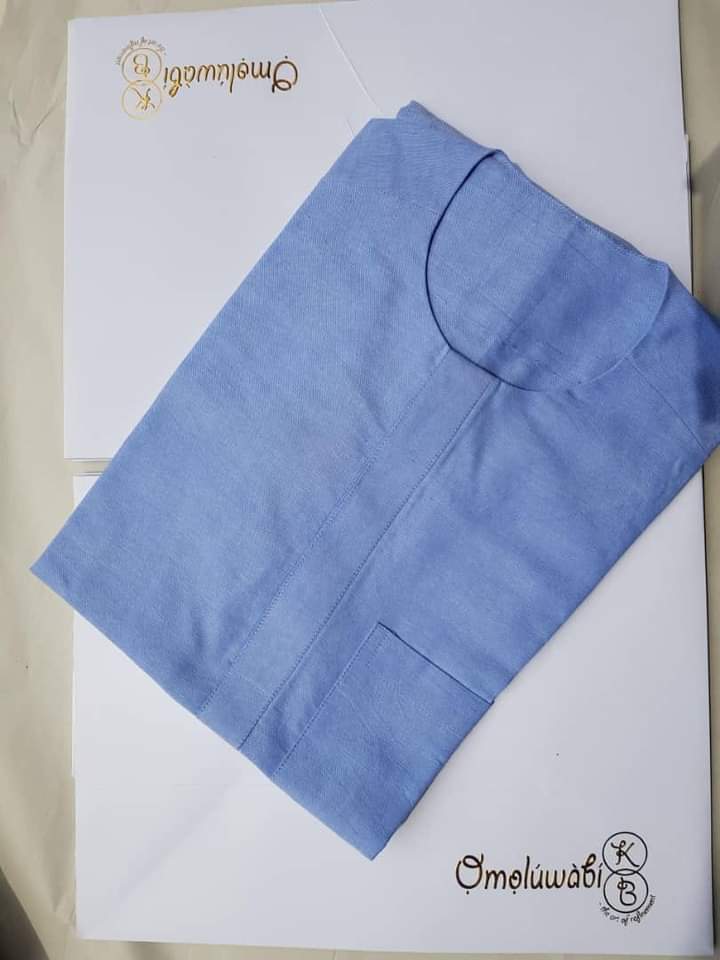 *NB: the accompanying pictures parade a blue 3-piece linen kaftan set, blue nubuck loafers with decorative buckles, a watch and reading glasses.