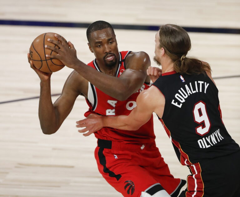 epa08582329 Toronto Raptors center Serge Ibaka (L) looks to pass the ball around defending Miami Heat forward Kelly Olynyk (R) during the second quarter of the NBA basketball game between the Toronto Raptors and the Miami Heat at the ESPN Wide World of Sports Complex in Kissimmee, Florida, USA, 03 August 2020. The NBA season has restarted at the Walt Disney World sports complex outside Orlando, Florida. EPA/ERIK S. LESSER SHUTTERSTOCK OUT