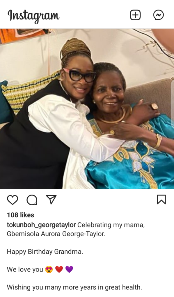 She wrote, “Celebrating my mama, Gbemisola Aurora George-Taylor. Happy Birthday Grandma. We love you…