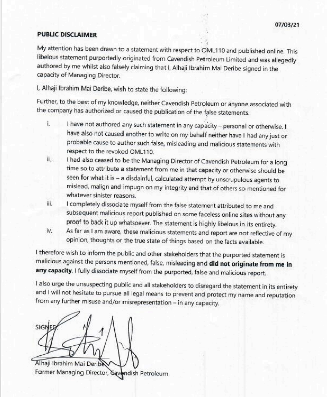 This libelous statement purportedly originated from Cavendish Petroleum Limited and was allegedly authored by me whilst also falsely claiming that I, Alhaji Ibrahim Mai Deribe signed in the capacity of Managing Director.