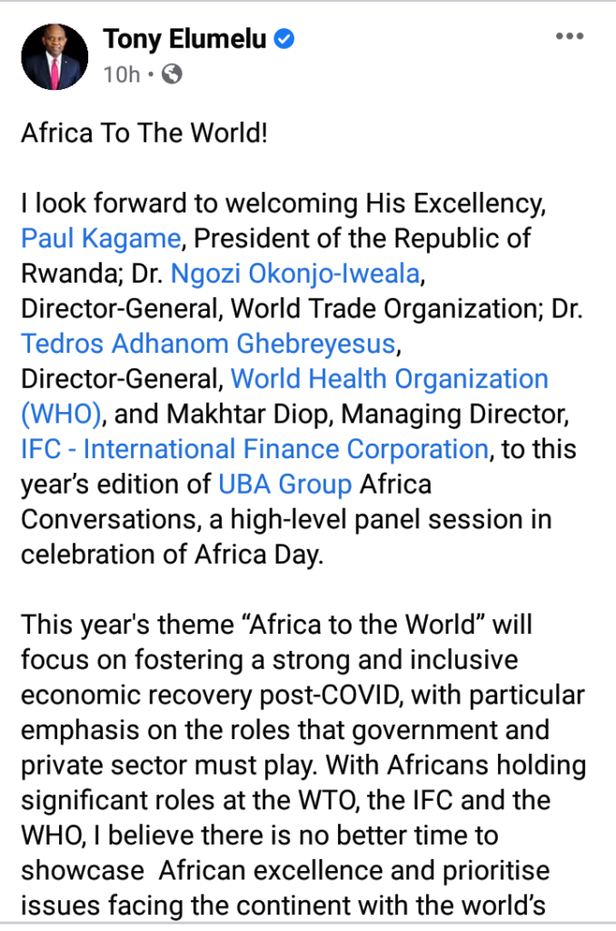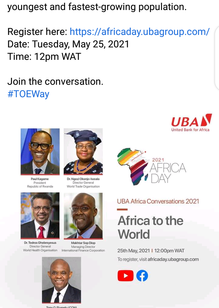 The event with registration portal as https://africaday.ubagroup.com/ will have Paul Kagame, President of the Republic of Rwanda; Dr. Ngozi Okonjo-Iweala, Director-General, World Trade Organization; Dr. Tedros Adhanom Ghebreyesus, Director-General, World Health Organization (WHO), and Makhtar Diop, Managing Director, IFC – International Finance Corporation as panelist while Mr Elumule who is the founder of the lives- changing The Tony Elumelu Foundation, Africa-based and African-funded philanthropic organization grooming Entrepreneurs across the continent will serve as moderator.