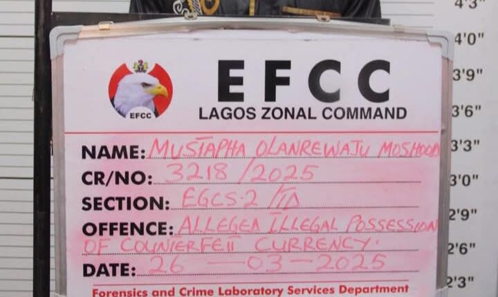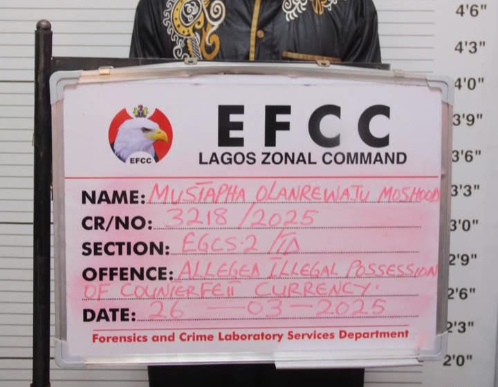 The Lagos Zonal Directorate 1 of the Economic and Financial Crimes Commission EFCC, on Thursday, April 10, 2025, arraigned one Moshood Mustapha Olanrewaju on a four-count charge bordering on alleged currency counterfeiting before Justice Yellin Bogoro of the Federal High Court sitting in Ikoyi, Lagos.