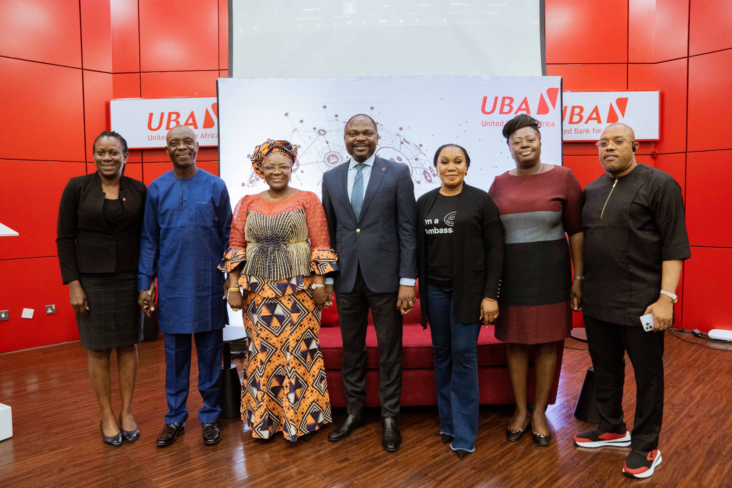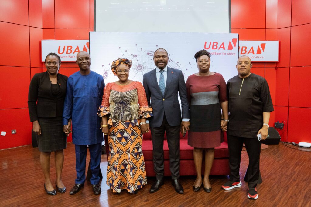 l-r: Group Head, Human Resources, United Bank for Africa(UBA), Modupe Akindele; Executive Member, UBA Alumni Network, Jide Ogunsino; Alumni President, Mosunmola Yusuf; Deputy Managing Director, UBA Plc, Muyiwa Akinyemi; Head, Alumni Relations, UBA, Yvonne Solomon; CEO, UBA Africa, Mrs Biola Bawuah; and Executive Director/GCOO, UBA Plc, Mr. Alex Alozie; during the relaunch of UBA Alumni Network at the UBA House on Friday