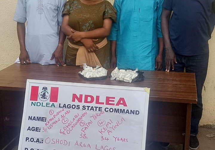 Those arrested during the intelligence-led operation include: Usman Kamorudeen, 31; Olasunkanmi Owolabi, 46; Fatai Yekini, 38; and a lady, Ayinla Kemi, 34. The four suspects were lodged in two rooms in the hotel where they had prepared 200 pellets of cocaine weighing 2.20 kilograms to swallow when NDLEA officers stormed their rooms.