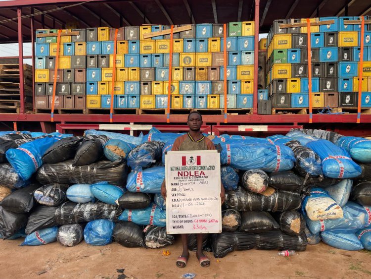 In Edo state, NDLEA operatives working on actionable intelligence on Saturday 11th April intercepted two long trucks marked LUY 172 XC and LUY 281 XC with bags of processed skunk concealed among cartons of beer along Warrake road, Auchi. One of the trucks was found to contain 3,900 kilograms of skunk, while the second had 3,345 kilograms, bringing the total weight to 7,245 kilograms. Five suspects arrested in connection with the seizure include: Ibrahim Abu, 29; Abu Abdullazeez, 28; Jibril Jaminu, 35; Andrew Moses, 22 and Ganiyu Abu, 21. The consignments were loaded at Sabongida-Ora in Owan West LGA and heading to Abuja when they were intercepted.