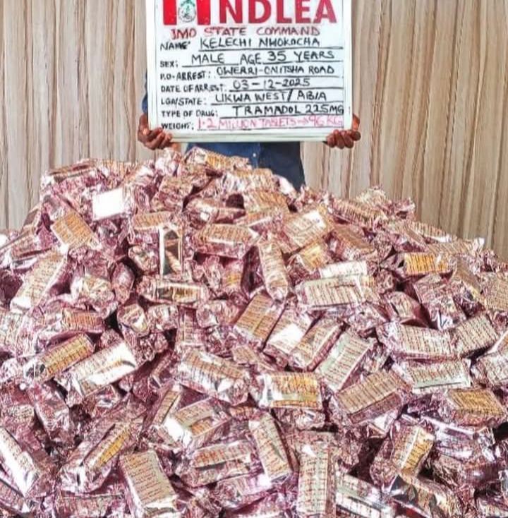 Out of the total opioids seized during the raids, not less than 3,874,000 pills of tramadol 225mg and 100mg, and others as well as 252.2litres of codeine syrup were recovered from a warehouse at Oko market, Asaba, Delta state on Saturday 6th December 2025, while no fewer than 1.2 million tablets of tramadol 225mg were seized from a suspect Kelechi Nwakocha, 35, on Wednesday 3rd December when NDLEA operatives on patrol at Orogwe, along Onitsha- Owerri road Imo state, intercepted his vehicle conveying the consignment which was loaded at Aba, Abia state, heading to Onitsha, Anambra state.