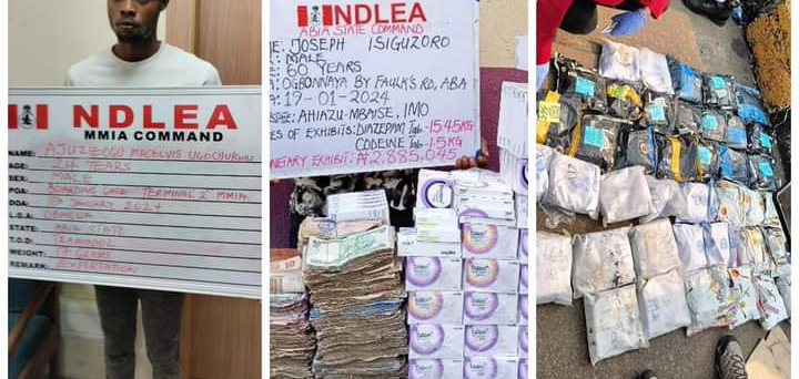 In Lagos, two suspects: Ali Abubakar and Murtala Sani were arrested at Ojodu Berger area on Tuesday 16th January with 110kg of cannabis sativa while 69kg of same substance was recovered from the hideout of a fleeing suspect in Akerele, Surulere same day. Not less than 2, 800 bottles of codeine-based cough syrup were recovered by NDLEA officers on Saturday 20th January during a raid operation at Aleyita FCT, Abuja. The suspected owner of the consignment, Jideofor Sochima is still at large.