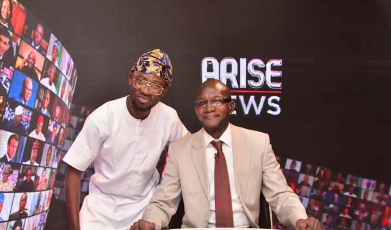 L-R: Ayeni Adekunle, NECLive Convener and CEO of BHM Holdings and Niyi Oyelowo, Host/Anchor, Arise News Now, Arise News Channel, during an exclusive interview discussing the recently released NECLive Report and the Nigerian entertainment industry on Arise News at the Arise TV Studio, Lagos, on Sunday, November 26, 2023.