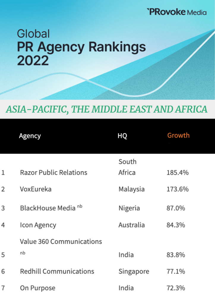 Other PR institutions that feature prominently in the top 10 on PRovoke’s top 15 ranking include Australia’s Icon Agency, India’s Value 360, Singapore’s Redhill, India’s On Purpose, India’s Kaizzen, regional corporate powerhouse Sandpiper, and Malaysia’s Rantau Golin.