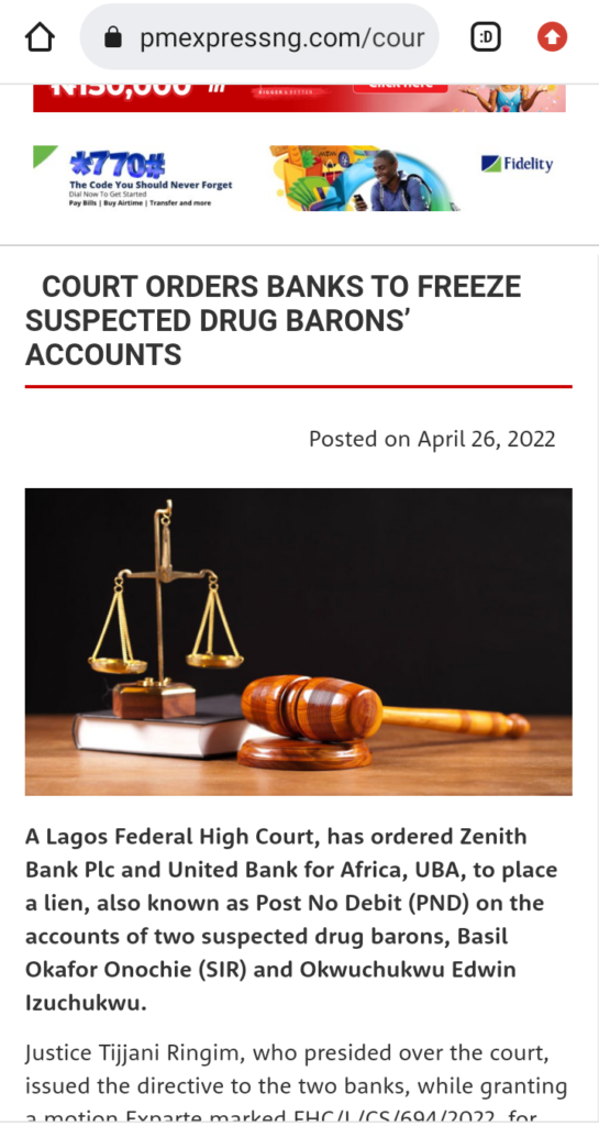 “Attached is the screenshot of our publication and the web link: https://pmexpressng.com/court-orders-banks-to-freeze-suspected-drug-barons-accounts/