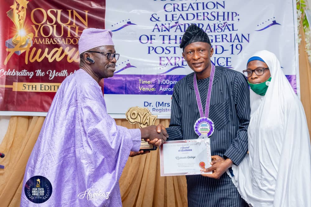 During the 5th edition of the Osun Youth Ambassador Award that held in Osogbo on Sunday the 27th of December, 2020, Mr. Rasheed Ademola Adebiyi, a lecturer in the department of Mass Communication at the Fountain University, Osogbo (FUO) was presented with an award of excellence as a worthy Osun Youth Ambassador.