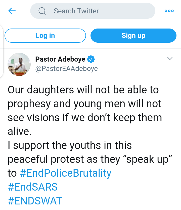 “Our daughters will not be able to prophesy and young men will not see visions if we don’t keep them alive. I support the youths in this peaceful protest as they “speak up” to #EndPoliceBrutality #EndSARS #EndSWAT”, Pastor Adeboye tweeted.