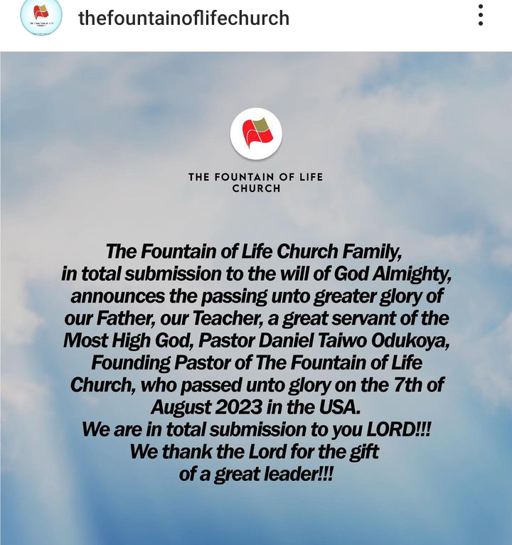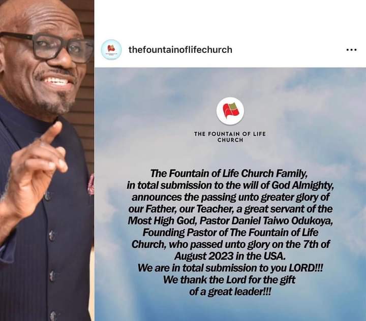“The Fountain of Life Church Family, in total submission to the will of God Almighty, announces the passing unto greater glory of our Father, our Teacher, a great servant of the Most High God, Pastor Daniel Taiwo Odukoya, Founding Pastor of The Fountain of Life Church, who passed unto glory on the 7th of August 2023 in the USA. We are in total submission to you LORD!!! We thank the Lord for the gift of a great leader!!!