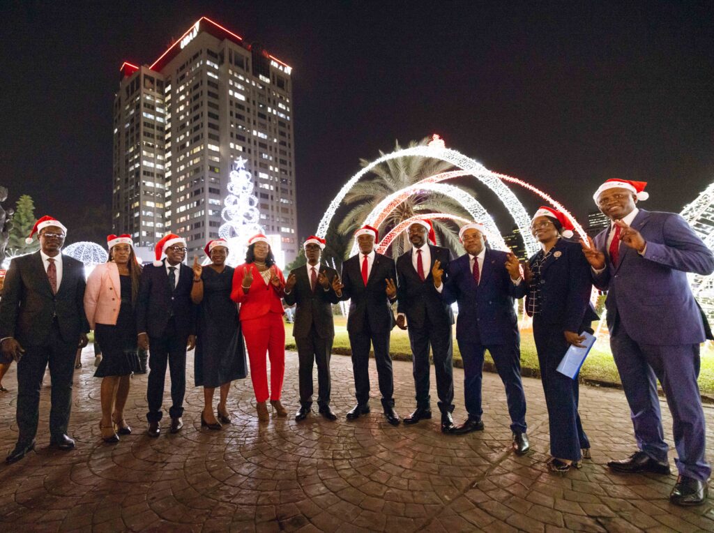 L-R: Head of Operations, West, Gboyega Sadiq; Group Head, Customer Experience, Michele Nwoga; Company Secretary, Bili Odum; Group Head, Human Resources, Modupe Akindele; CEO, UBA Africa, Abiola Bawuah; Group Deputy Managing Director, Chukwuma Nweke; GMD/CEO, Oliver Alawuba; Group Deputy Managing Director, Muyiwa Akinyemi; Executive Director, Alex Alozie; and Regional Director, East Bank, Chioma Mang; Executive Directors, Ugo Nwaghodoh; during the Christmas Light Up, to herald yuletide at the UBA Foundation Garden in Marina on Monday