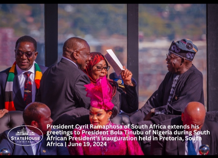 3. Immediately after President Ramaphosa finished the anthem, he went ahead to greet the visiting presidents who were all seated in the second row (similar to the way visiting presidents were seated in the third row during Nigeria’s own inauguration on May 29, 2023 – see pictures below).
